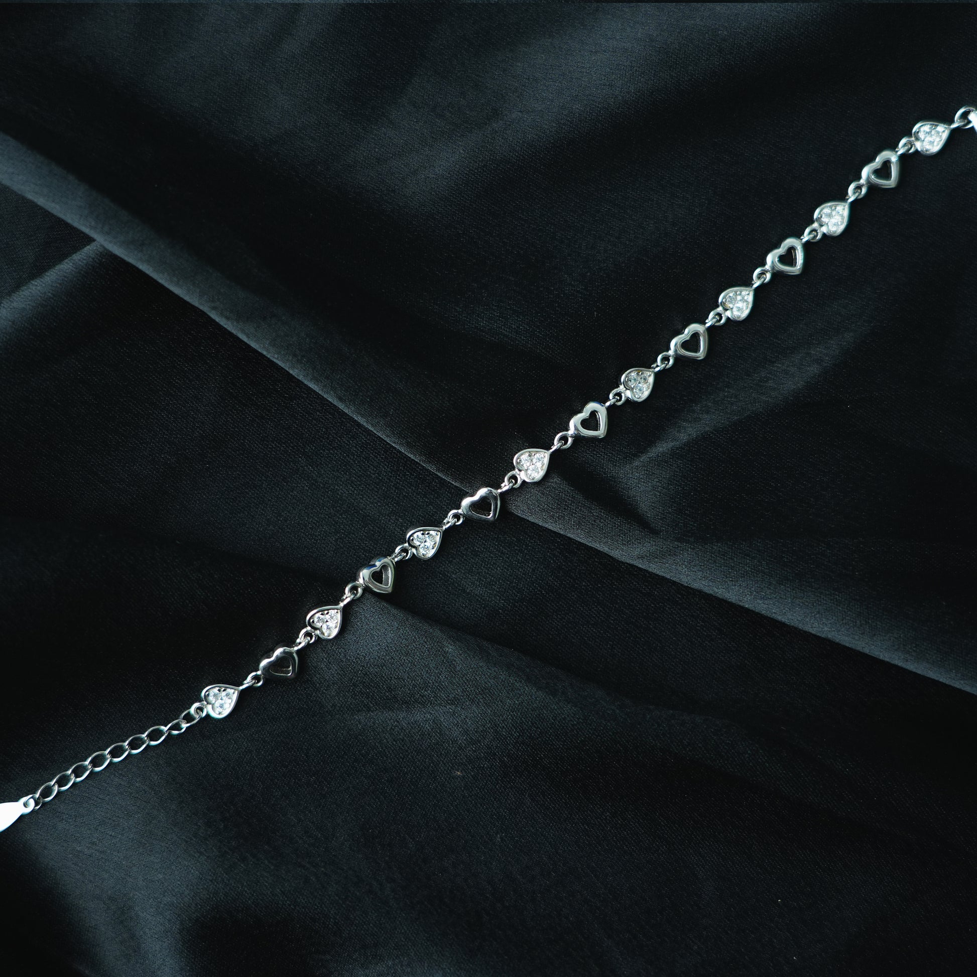 The Silver Heart Chain Bracelet is a delicate piece designed with interlinked tiny silver hearts and sparkling cubic zirconia stones. Its romantic and graceful design makes it a perfect symbol of love and elegance. Crafted in 925 sterling silver, this bracelet is lightweight, durable, and shines with a timeless charm.